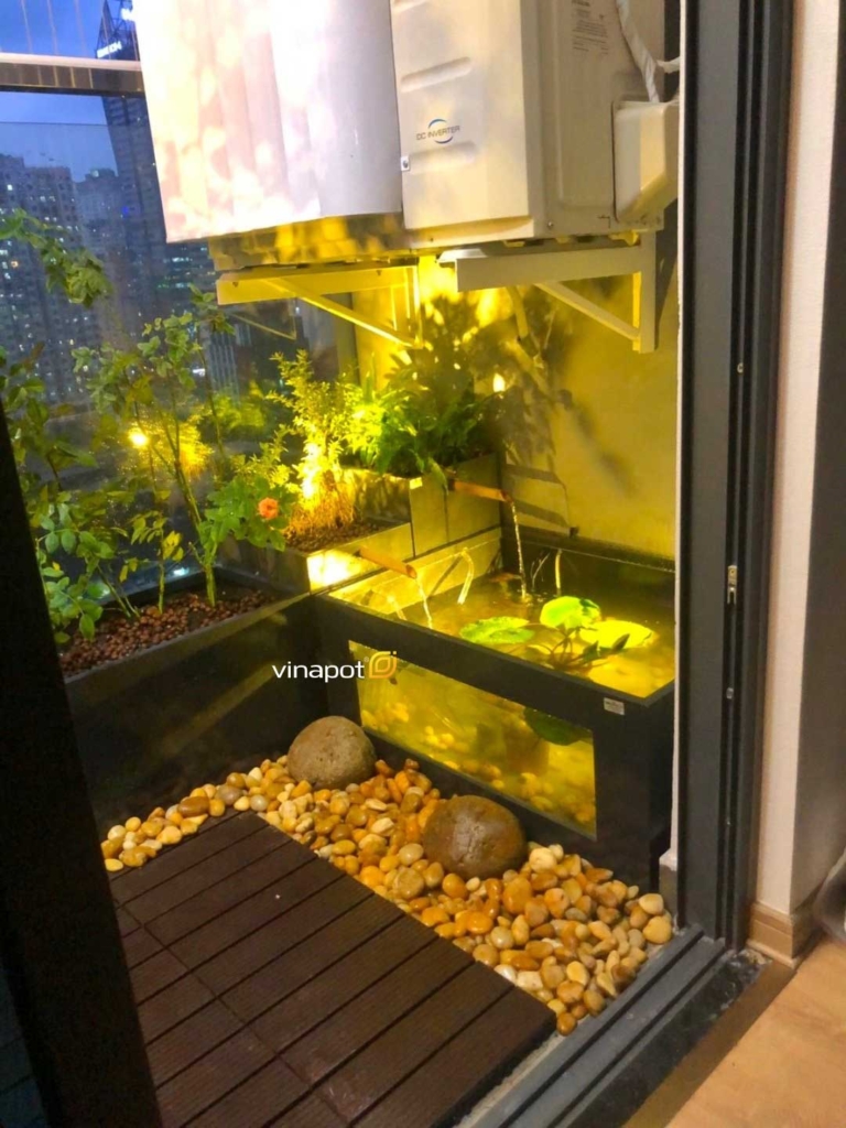 Tiểu cảnh bể cá ban công chung cư Ngoại Giao Đoàn Tiểu cảnh ban công kết hợp thả cá